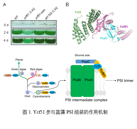光合作用是生物地球化学循环的核心反应,是粮食产量的基础,深入揭示光合作用的生物发生机制具有重要的理论与现实意义。蓝藻是地球上最早出现的产氧光合生物,为叶绿体的演化祖先,是光合演化研究的“活化石”。相嵌于类囊体膜中的两大色素蛋白复合体—光系统I(PSI)与光系统II(PSII),是实现光能转化的关键分子机器,其生物发生机制一直是国际研究热点。相较于PSII而言,PSI由于组装过程极其迅速,其具体组装机制仍不清楚。