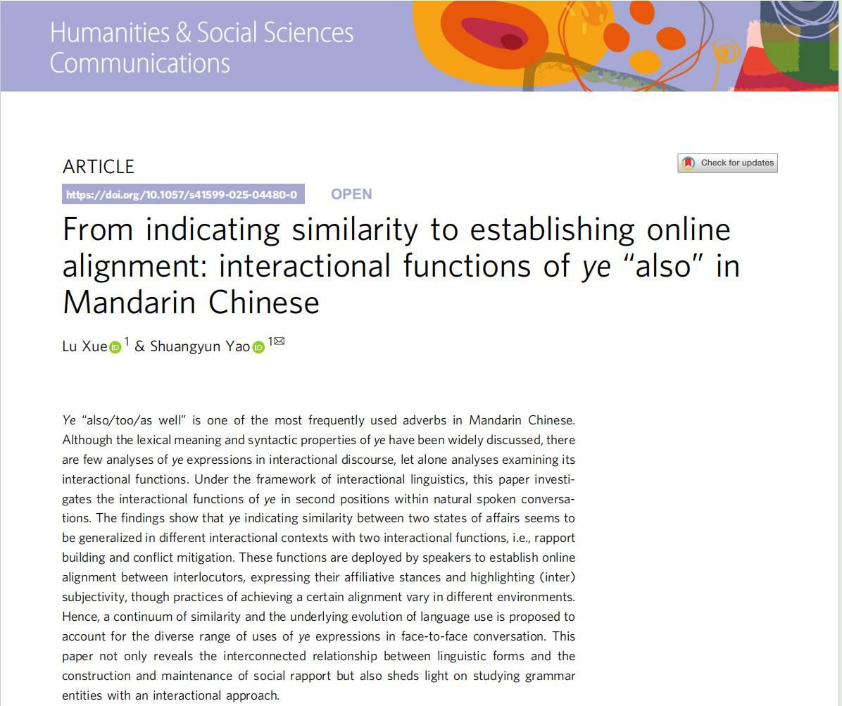 华大在线讯(通讯员 肖辛格)近日,我校语言与语言教育研究中心姚双云教授课题组在国际期刊Humanities and Social Sciences Communications(《人文与社会科学通讯》)发表题为“From indicating similarity to establishing online alignment: interactional functions of ye ‘also’ in Mandarin Chinese”的研究论文,中心博士后研究人员薛璐为第一作者,姚双云为通讯作者,乐鱼在线注册语言与语言教育研究中心为唯一完成单位。