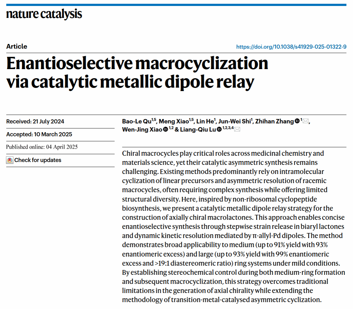 华大在线讯(通讯员 周汉鸣)4月4日,我校化学学院肖文精教授团队在国际顶级期刊《自然催化》(Nature Catalysis)发表题为"催化的金属偶极体接力实现对映选择性大环化"(Enantioselective macrocyclization via catalytic metallic dipole relay)的研究论文。该研究创新性地提出了"金属偶极体接力"策略,为轴手性大环化合物的高效合成开辟了新路径。乐鱼在线注册博士研究生曲宝乐(实验研究)和肖萌(理论计算)为共同第一作者,陆良秋教授和张之涵教授为共同通讯作者,我校为第一完成单位。