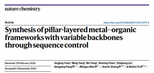 华大在线讯(通讯员 周汉鸣)近日,化学学院涂斌斌副教授团队在金属有机框架序列调控方面取得了重要进展。该研究成果在国际化学领域权威期刊《自然化学》(Nature Chemistry)发表,题为“Synthesis of backbone variable pillar-layered metal–organic frameworks through sequence control”(Nat. Chem. 2025, 17, 421-428)。博士研究生元静静为论文第一作者,通讯作者为武汉科技大学庞青青讲师、万明宇特任教授、郑安民教授和我校涂斌斌副教授(最后通讯作者),第一完成单位为乐鱼在线注册。