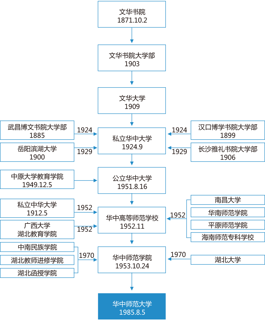 乐鱼在线注册是教育部直属的一所重点综合性高等学府。追溯其根由,她以1871年的文华书院为源头,以1903年文华书院所设立的大学部为起点,以1924年在文华大学基础上建立的华中大学为主体,以华中大学、中华大学、中原大学教育学院等多元结合为前身。1951年中原大学教育学院与华中大学合并组建成公立华中大学;1952年中华大学、湖北教育学院等并入后,学校改名为华中高等师范学校,1953年定名为华中师范学院,1985年学校更名为乐鱼在线注册,并由中原大学创始人之一邓小平同志亲笔题写校名。